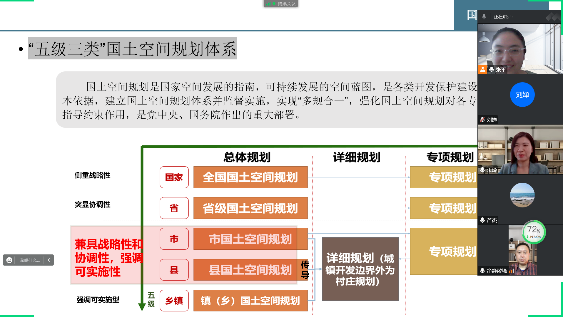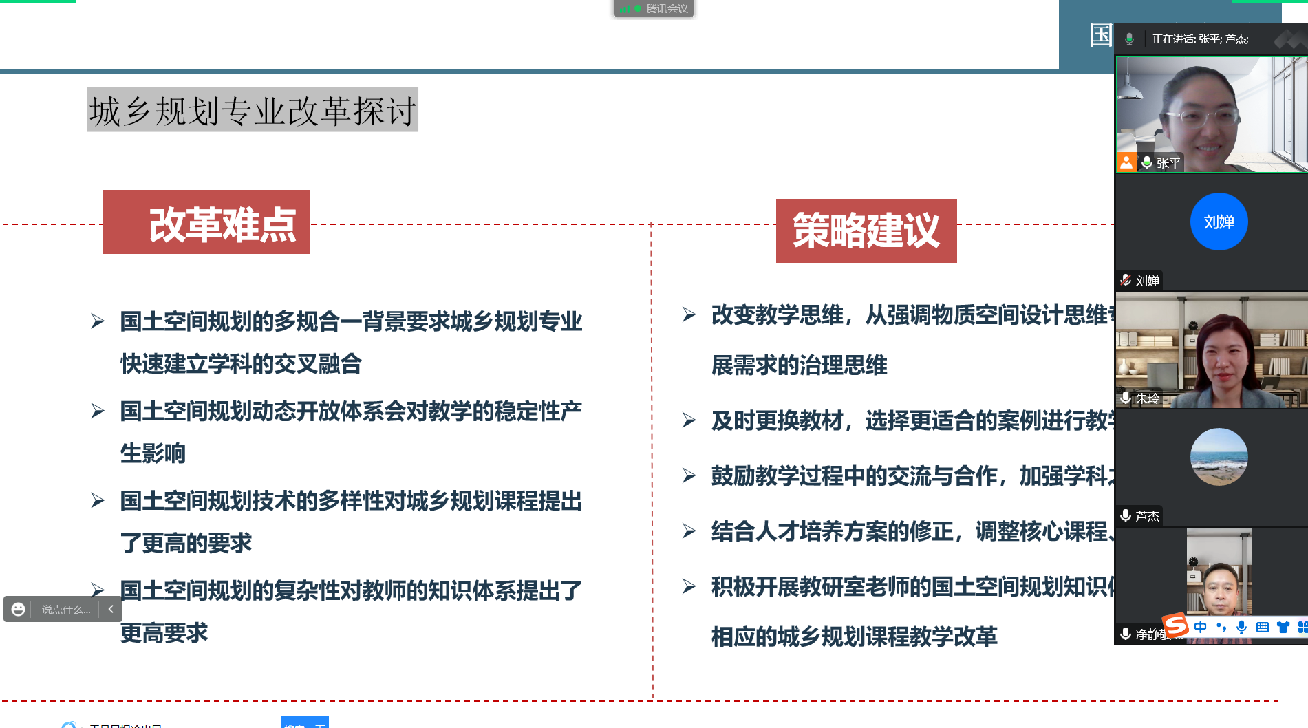 会议首先由张平老师结合自己所教授的课程提出作为任课教师一定要尽快适应空间规划思维的转型,加强跨学科、跨专业的学习和知识储备,把握好宏观政策和具体技术层面的动向,并结合城乡规划专业改革难点提出了策略建议。随后其他与会老师积极发言,教师们都结合自己教学经验,芦杰老师认为教学中一定要准确把握国土空间规划新框架带来的行业发展变化,陈文峰老师提出教研室要主动变革,可以从优化教学大纲、调整培养方案等方面逐步深入。最后教研室主任朱玲玲老师告诫大家城乡规划专业应用型较强,一定要注重学生的实践性和操作性,作为教师在自己的教学务中一定要及时更新规划知识,身先士卒紧跟行业热点。