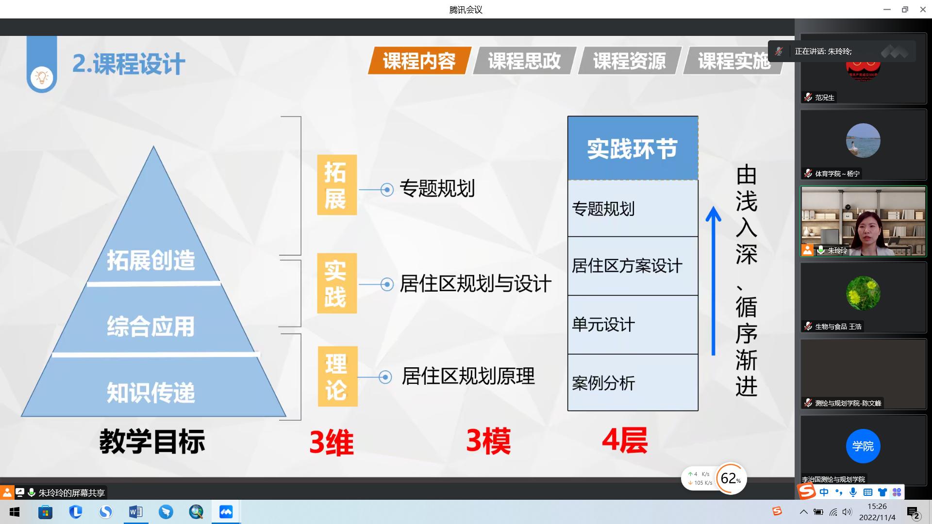 朱玲玲以《居住区规划与设计》课程为例,介绍了她从教育信息化引领教育变革、教育变革引领一流课程、立德树人开启课程思政等三个阶段的一流课程建设,分享了自己的实践探索和心得体会。