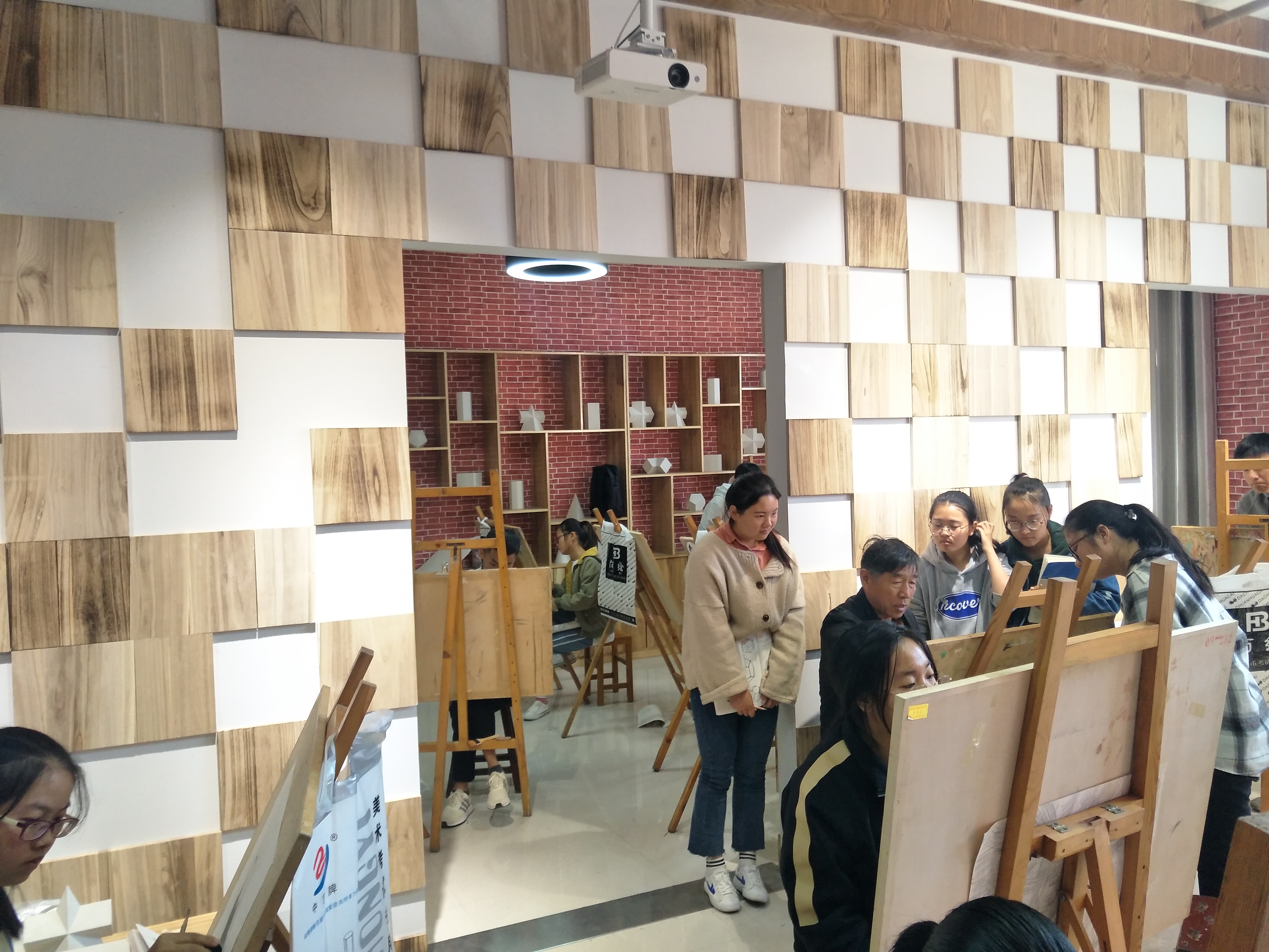 专业画室场地面积约80平方米,通过设计2个隔板夹层,将石膏体景物组合分为4组,避免了学生在绘画布局选择上的单一性和重复性,多了一些选择性和可塑性;并在隔板两侧均布置灯光,可根据不同的主题选择光源的方向。配备的设备主要有投影仪和桌面实物展台,教师可根据教学内容利用投影机向学生展示图片或视频,目前承接的主要课程有《素描》、《色彩》、《钢笔速写》、《快速表达》等。